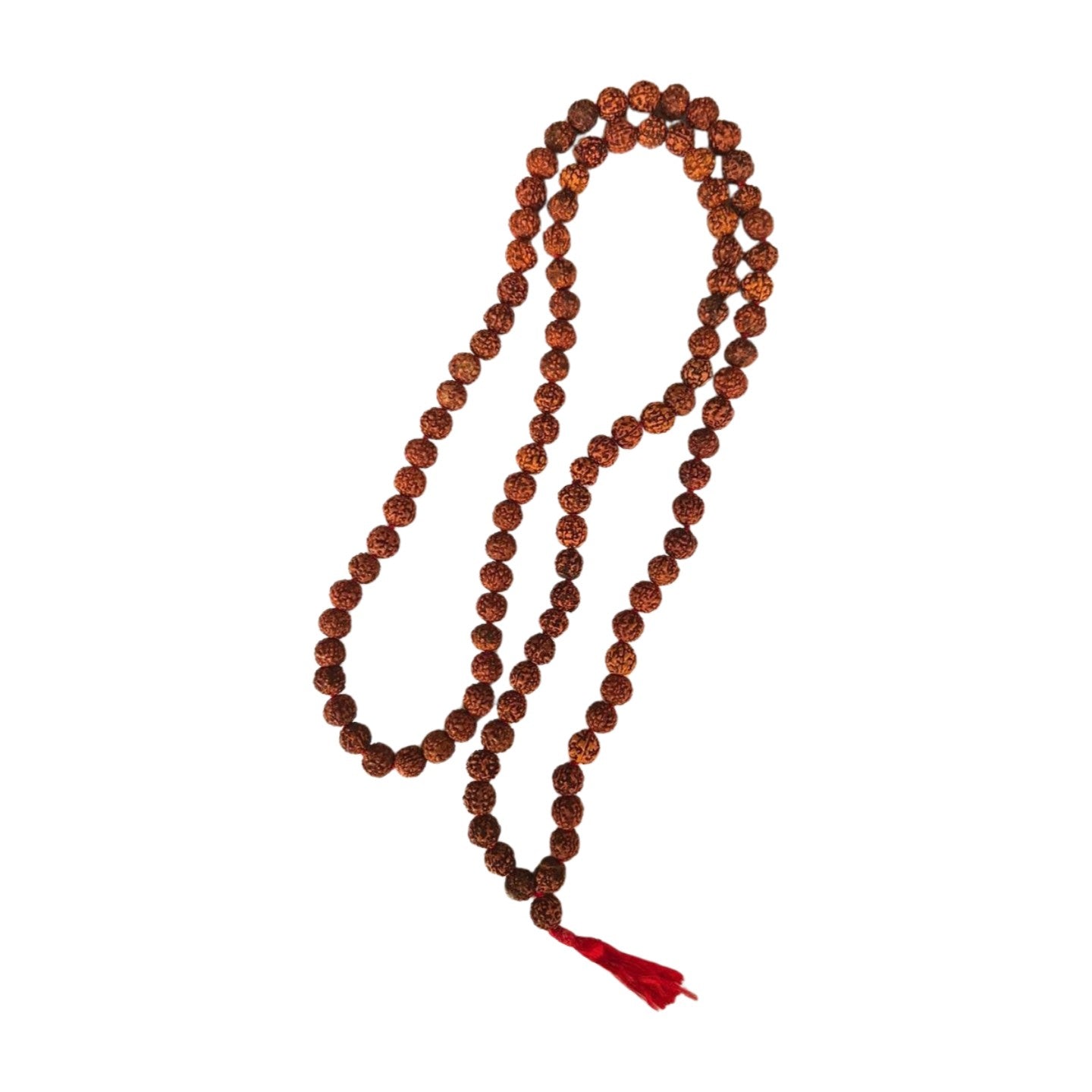 Typically worn around the neck or wrapped around the wrist, these rudraksha beads (measuring 9mm with an overall length of approximately 95cm) come from the sacred rudraksha tree’s dried seeds. Comparable prayer beads exist worldwide under various names, reflecting their deep cultural significance.