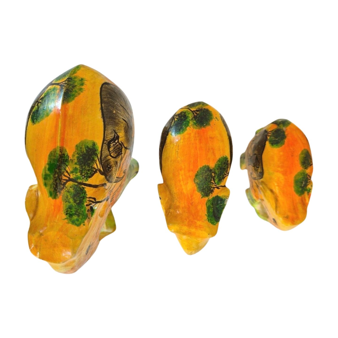 This item is a 'Family' of 3 Elephants - Large, Medium and Small in size. See below for precise dimensions. These are all painted over the bodies. All 3 are finished with a protective lacquer coating.