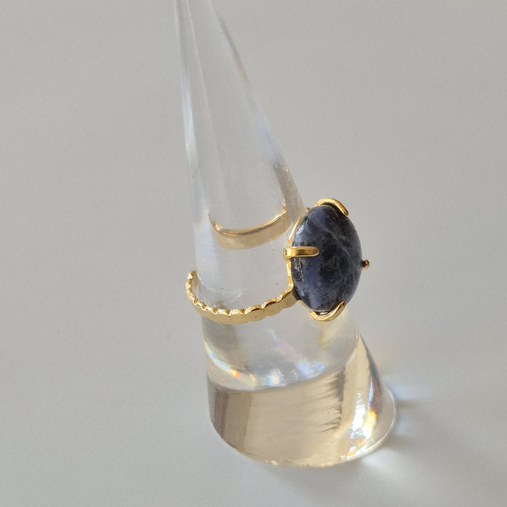 This refined sodalite ring exemplifies understated elegance with its rich indigo stone set in gold-plated copper. Meticulously crafted to exclude nickel and rhodium, it caters to discerning wearers with sensitive skin or metal sensitivities. The adjustable band accommodates various sizes without compromising aesthetic appeal. Sodalite's association with mental clarity and intuitive wisdom adds a layer of sophistication beyond its visual allure. An investment piece that marries timeless design with conscientious craftsmanship.