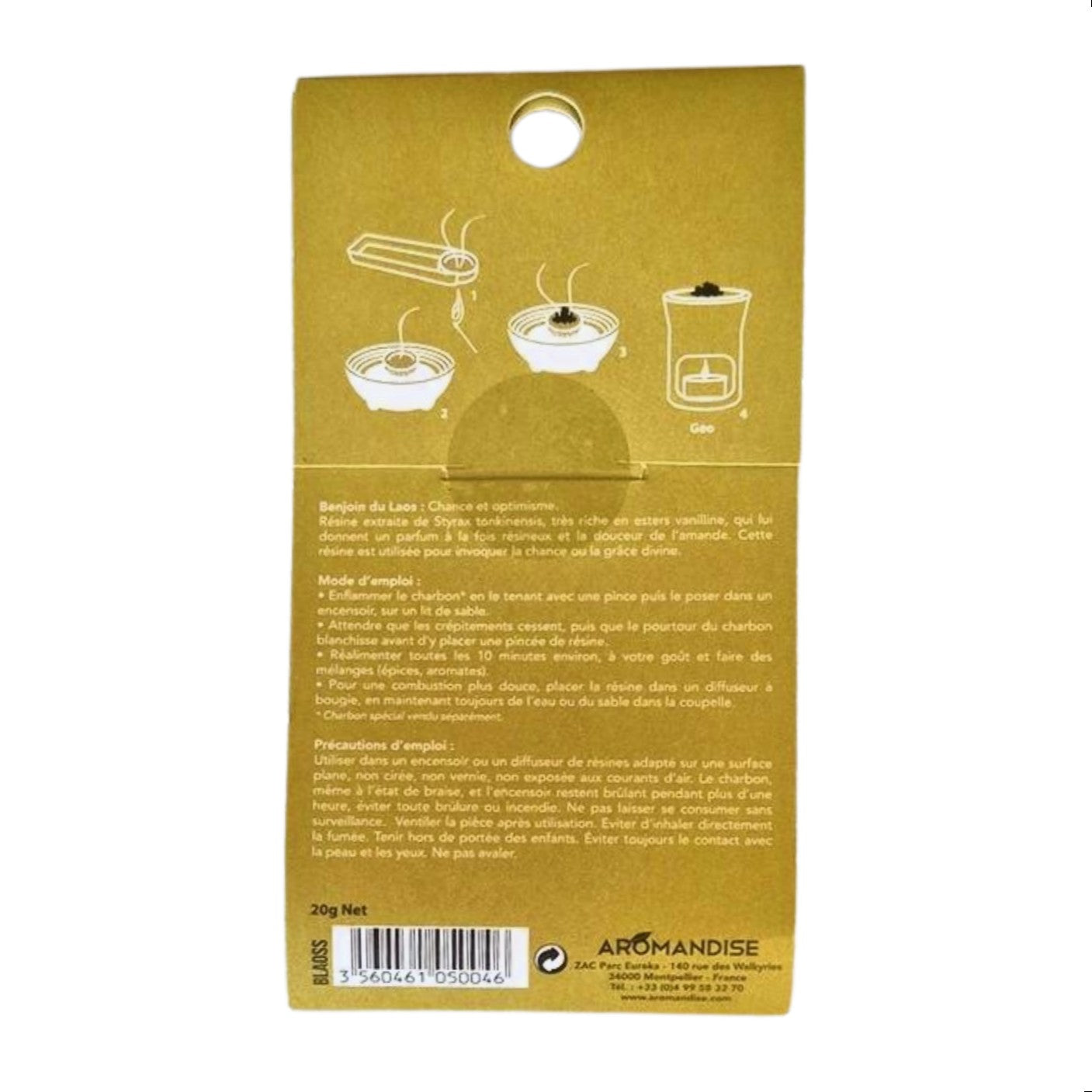 Benzoin Resin from Laos, extracted from Styrax Tonkinensis, releases vanilla, amber and warm scents. It is recognized for its spiritually purifying virtues and is conducive to invoking luck or divine grace. It is very rich in benzoic acid and vanillin esters which give it that balsamic scent and a vanilla sweetness.