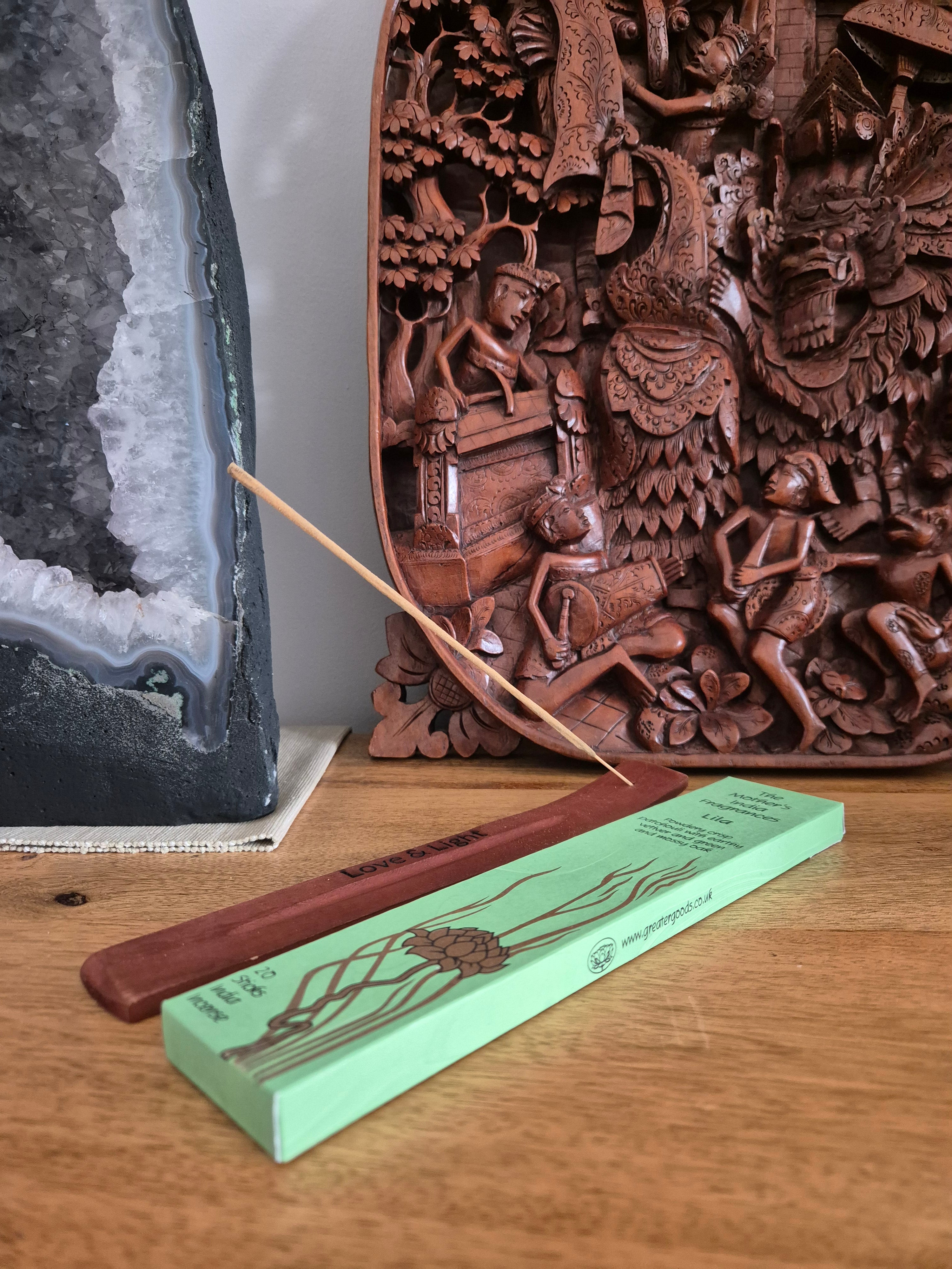 The Mother's India Fragrances incense is made from pure natural ingredients, hand-rolled by the ancient masala method. It's a premium-quality fair-trade product, made at Pondicherry in South-eastern India. The end result is a light and clean-burning incense of exceptional quality.