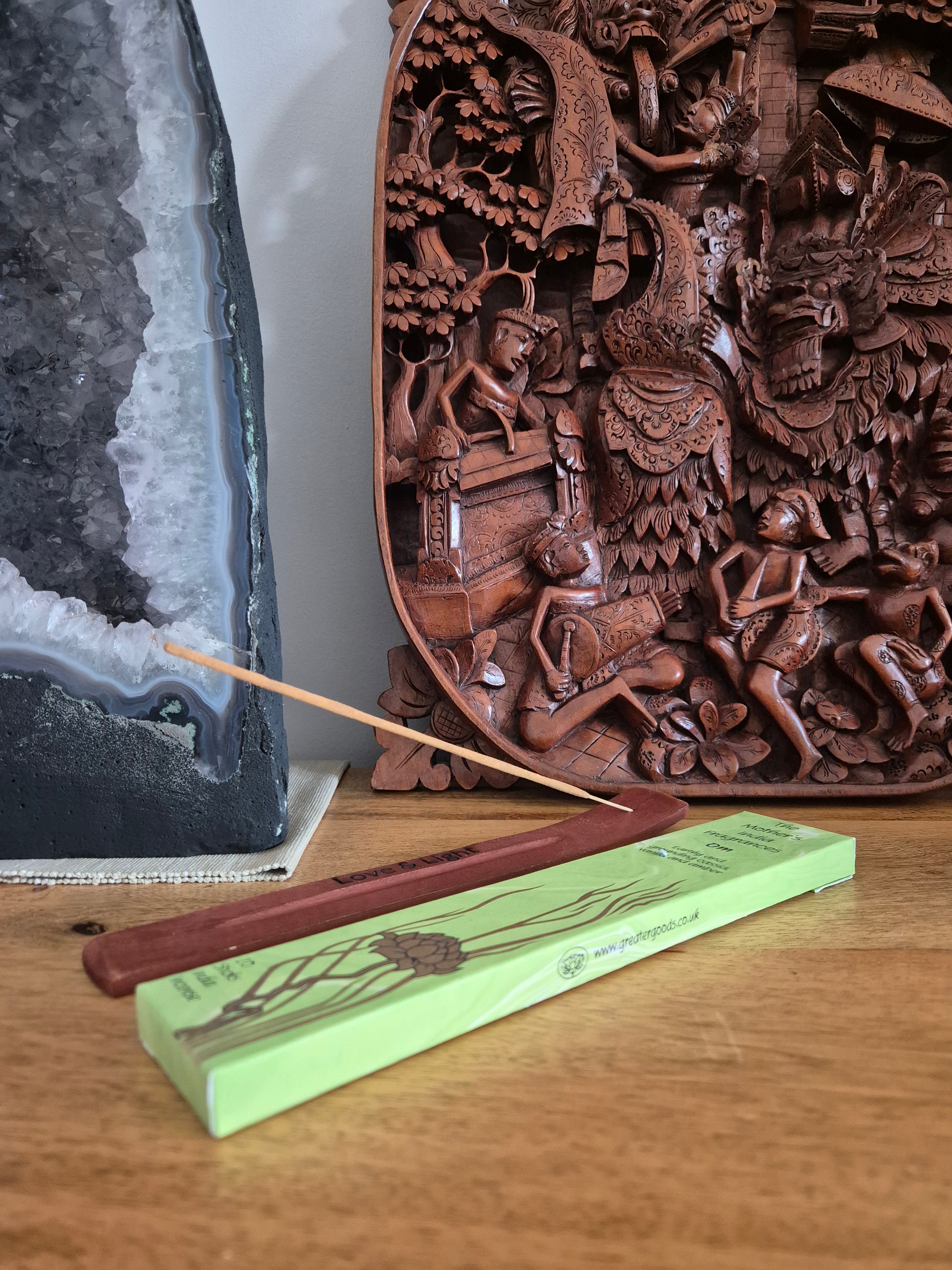The Mother's India Fragrances incense is made from pure natural ingredients, hand-rolled by the ancient masala method. It's a premium-quality fair-trade product, made at Pondicherry in South-eastern India. The end result is a light and clean-burning incense of exceptional quality.
