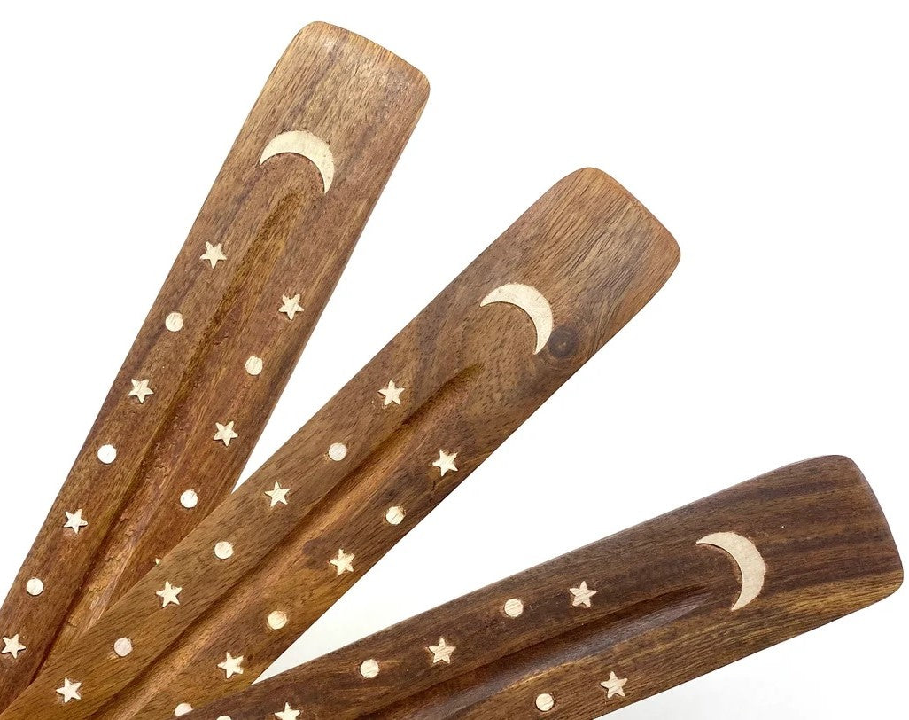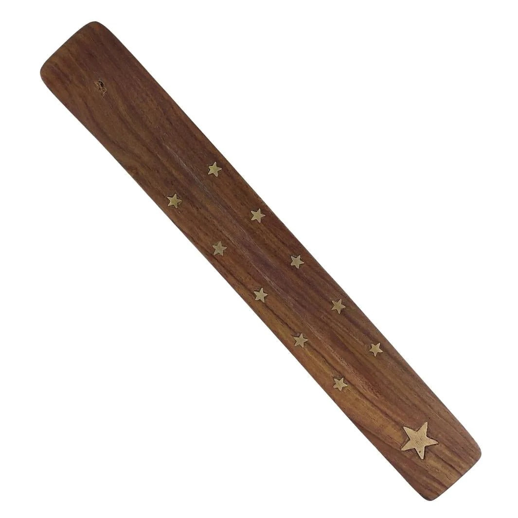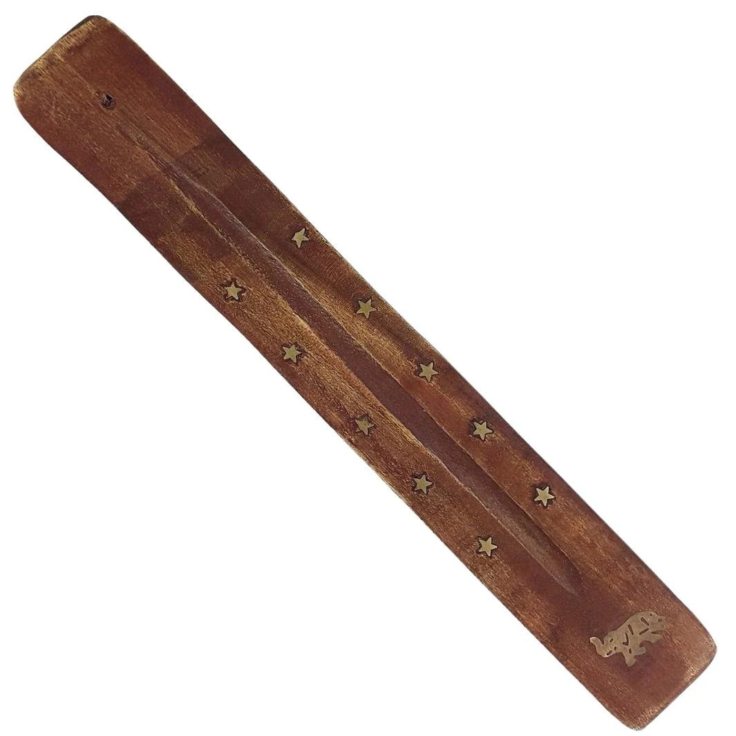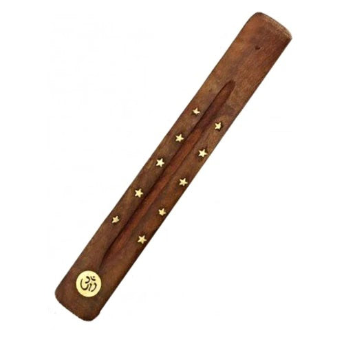 A classic wooden incense holder / ash catcher, with attractive inlaid brass decoration, hand-made in India.