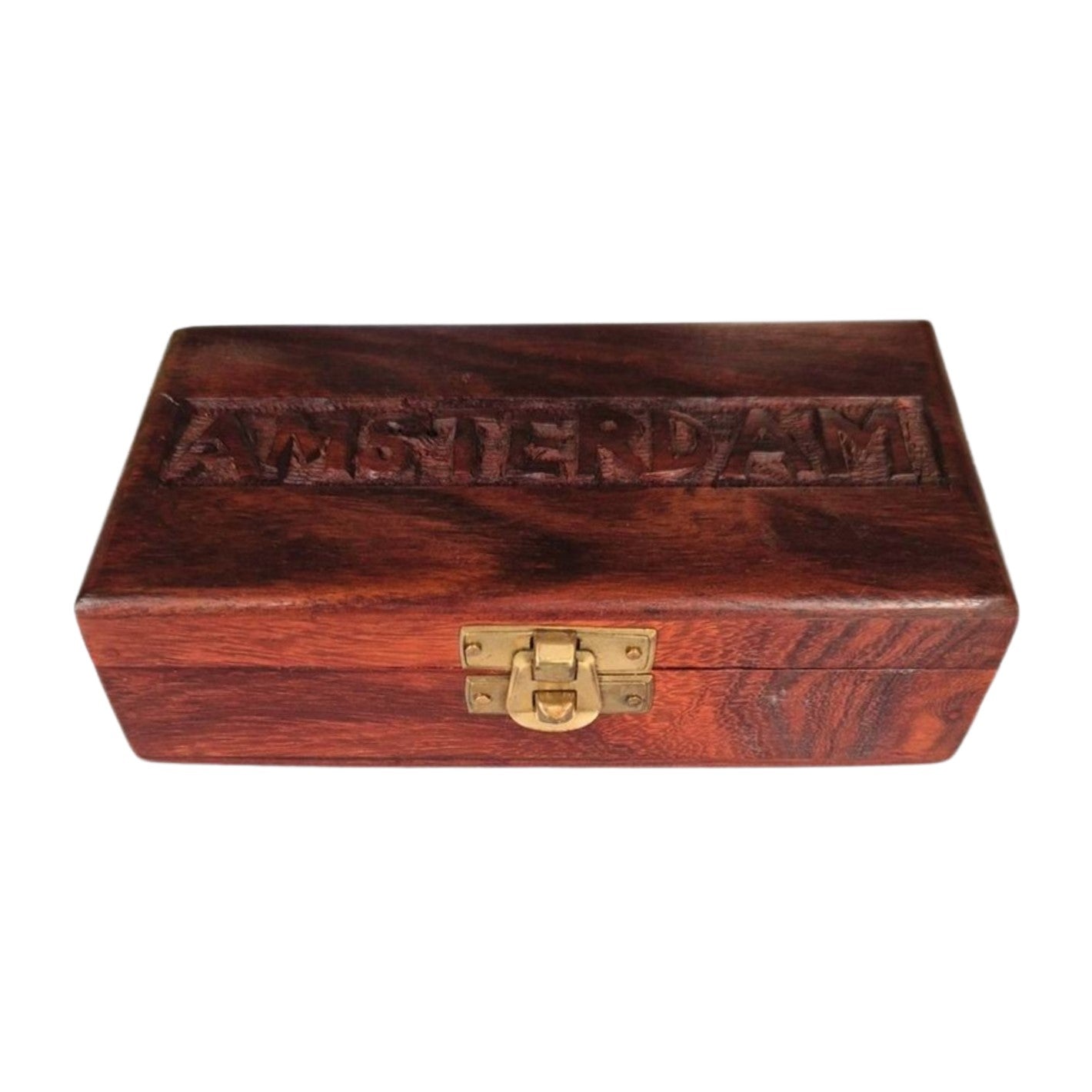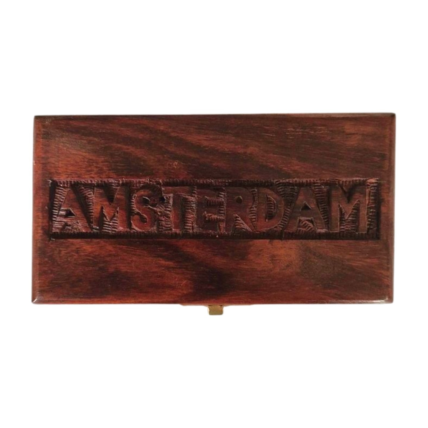 The lid fastens with a neat little brass catch, and the top of the box bears a carved decoration, reading "Amsterdam".