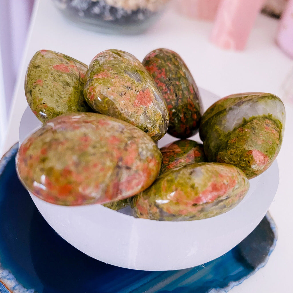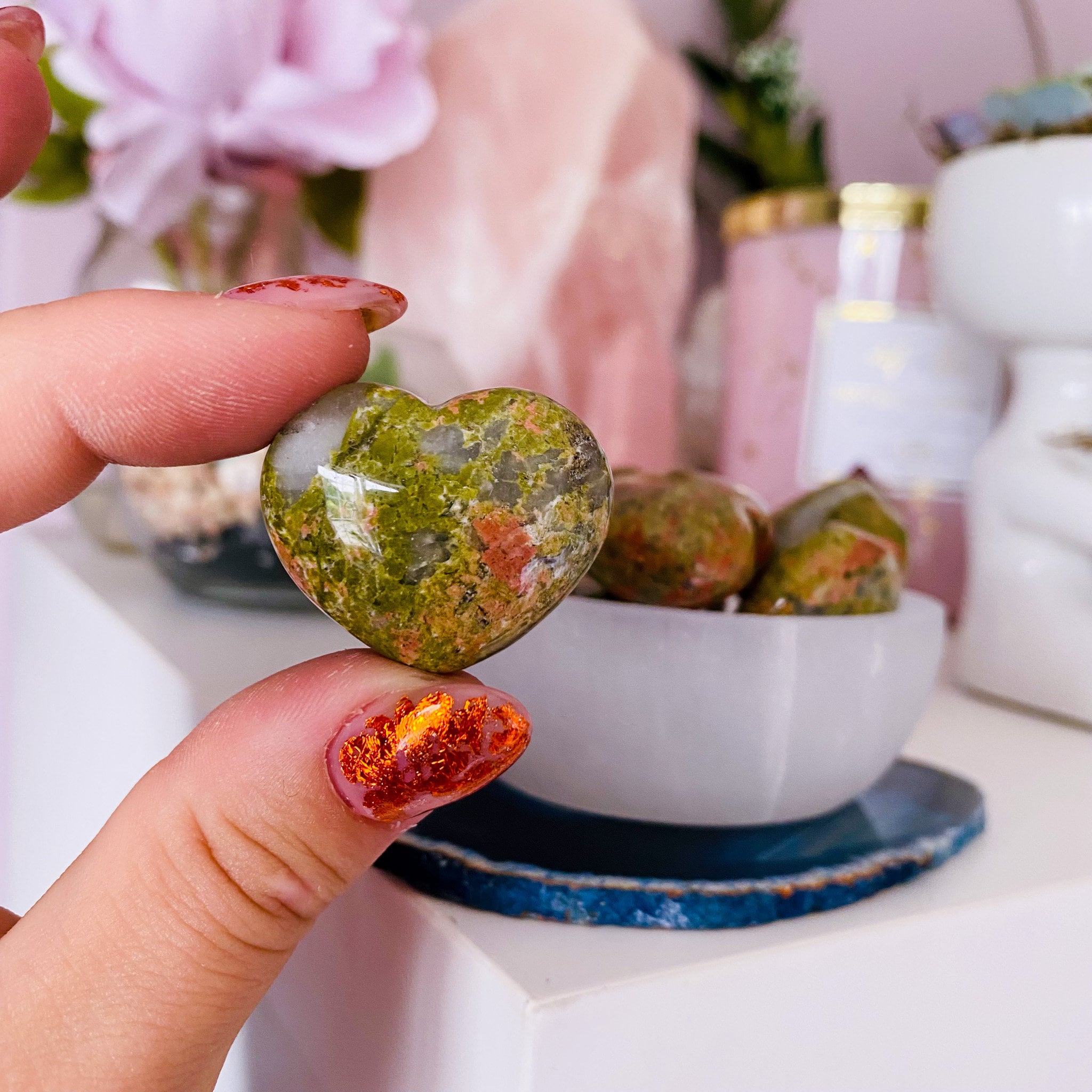 Unakite is made up of a blend of Red Jasper & Epidote, how amazing is that?! Its pink & green energies balance & align the heart chakra, lift spirits when youโre down, & help to release deep-seated emotions in a slow & gentle way ๐๐ปโโ๏ธ