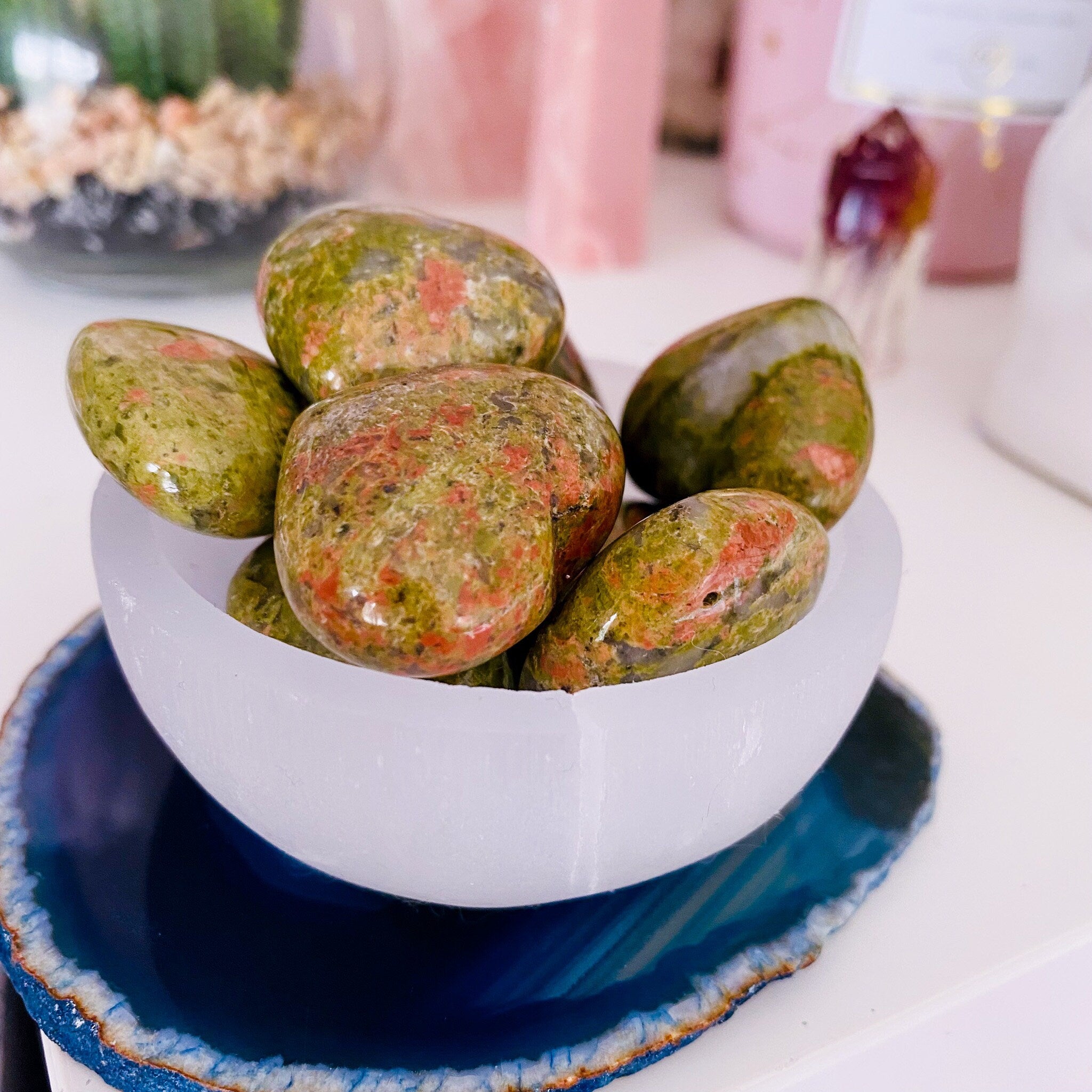 Unakite Jasper is one of the most healing crystals of the heart & mind, it brings together the abundant, nurturing energy of green with the soft & the caring passion of pink. It resonates deeply with the frequency of love, compassion & kindness, & is a stone dedicated to balancing the emotional body.